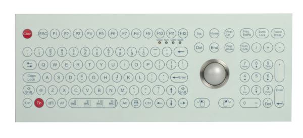 DESCRIPTION: 108 keys IP67 dynamic rated industrial membrane keyboard with full keyboard functionalities with integrated numeric keypad and function keys on the upper line, IP68 dynamic rated washable 38.0mm optical trackball module with 800 DPI resolutions for fast and accurate cursor position, 2.0mm thickness industrial metal dome PCB with gold-on-gold metal dome key switch technology with short stroke 0.45mm with extremely good tactile feeling for reliable data input, with Clean key for easy cleaning via lock/disable the entire keyboard without needing to take the keyboard from PC, surface mounted extremely flush with anti-microbial, durable and scratch-proof polyester withstand to most chemicals and liquids under the harshest environments, ruggedized and backed with 3.0mm aluminum plate with sand blasting & oxygenation treatment, top panel mounted.